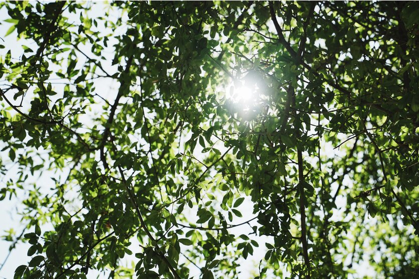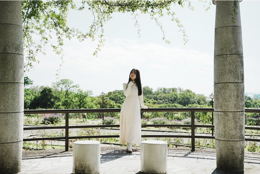 ドーム型の建築物と逆光が美しい場所で、モデルさんに真ん中に立ってもらいました。ちょうどお昼頃の時間帯で、トップ光に近いため、右上から光が差し込んでいるのがわかります。しかし無駄なフレアやゴーストが出ていないことに驚きました。よく見ると細かく垂れ下がった植物の蔓もディテールが潰れることなく解像しています。