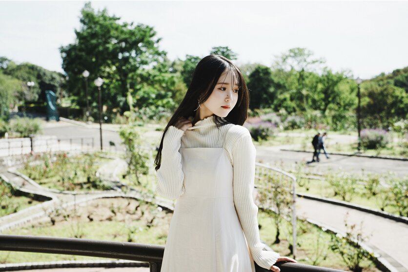 モデルさんに寄ってみた場合はどうなるのか、2枚目の写真より近づいて撮影してみました。先ほどより更に背景にボケを感じられるようになりました。ボケ感はいやらしくなく、程よくディテールを残しています。しかしはっきりと浮き出る被写体との境は非常に美しく、またF4のおかげもあり、髪の毛やまつ毛など、細かい部分の描写もパーフェクトです。