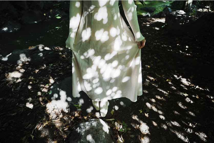 カメラを下に向けてみると、地面にも可愛らしい丸い木漏れ日が揺れていました。モデルさんのスカートにおちる、自然が作るパターンを瞬時に画角を変えて撮影した1枚です。50mmから25mmへ、1秒もかからないそのレンズワークは単焦点レンズにはない快適さでした。こういった何気ない瞬間にこそ、撮り手の気持ちが入り込むと考えています。