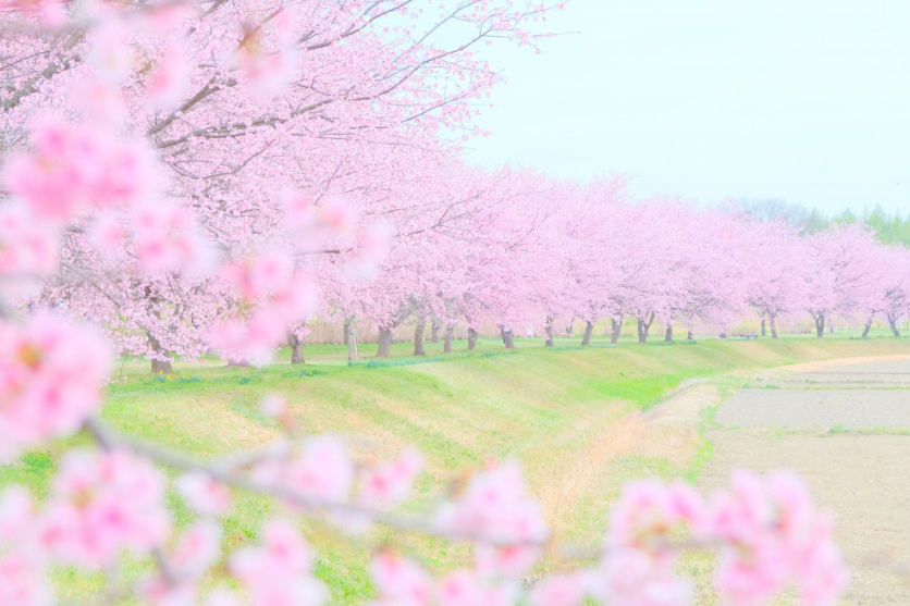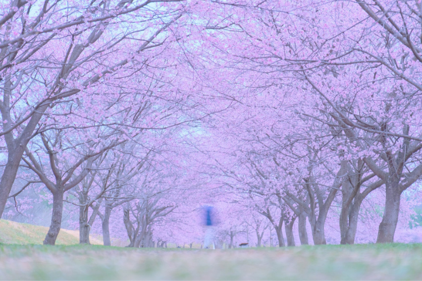 素敵な桜並木が多いのも埼玉の魅力のひとつ。まずは眠い目をこすりながら早朝の北浅羽桜堤公園へ。日中は人も多くなるので、人のいない並木を撮りたいのならば朝早く行くしかありません。予報は晴れだったのですが、残念ながら朝方は曇りで、キラキラの桜は撮影できませんでした。しかし、しっとり優しい雰囲気の写真を撮ることができました。シャッタースピードもかなり落ちていたので、地面にカメラを置いてパシャリ。