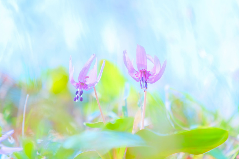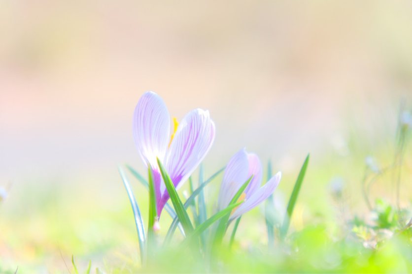 次は春を喜び空に向かって歌っているようなクロッカスです。とても背の低いお花なので、芝生に寝ころびながら同じ目線で撮影しました。このレンズの、70mmという決して望遠ではない焦点距離を使う時、一輪のアップというより、余白をうまく使って楽しむと良いと思います。この写真もトロトロにとろけるようなボケが美しいです。