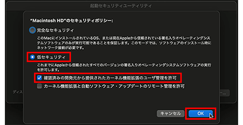 6.「低セキュリティ」を選択後、「確認済みの開発元から提供されたカーネル機能拡張のユーザ管理を許可」を選択し、[OK]をクリックします。 (アプリの利用を終了した後に元の設定に戻せるように、変更前の設定を記録しておくことをお勧めします。)