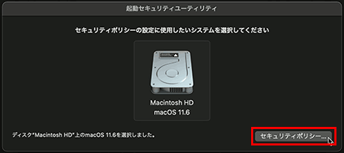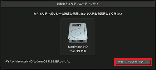 5. 表示された起動ディスクの中から、使用するディスクを選択後、[セキュリティポリシー]をクリックします。