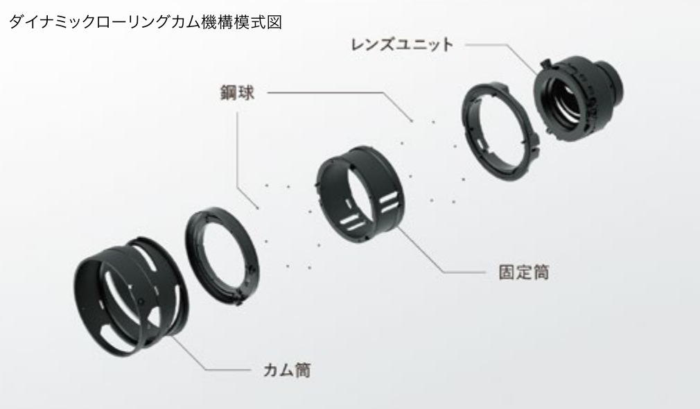 コンパクトなレンズボディに高倍率ズーム機構を内包し、鏡筒を確実に保持するための多層カム構造。広角側でのコンパクトサイズを実現しながら、望遠側で必要な鏡筒長を確保するための、スムーズで剛性のある、確実な2-3段繰り出しを行うタムロンのオリジナル・テクノロジーです。