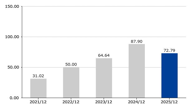 | EPS(1株当たり当期純利益) | 31.02 | 50.00 | 64.64 | 87.90 | 72.79 |