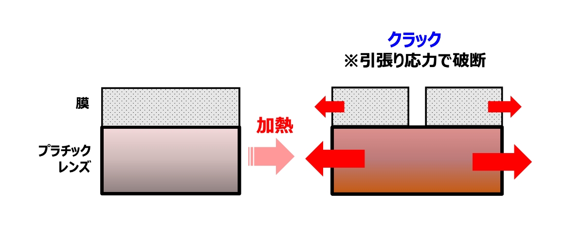 車載用レンズには長期間にわたる高い耐久性が求められます。小型軽量で設計の自由度が高く、コストメリットの良いプラスチックレンズは、温度変化に対して耐性が低く、そのため施したコーティングがその変化に対応しきれず、コート上にクラックやしわを生み出し、センサーに正確な情報を伝えられない原因となる場合があります。
